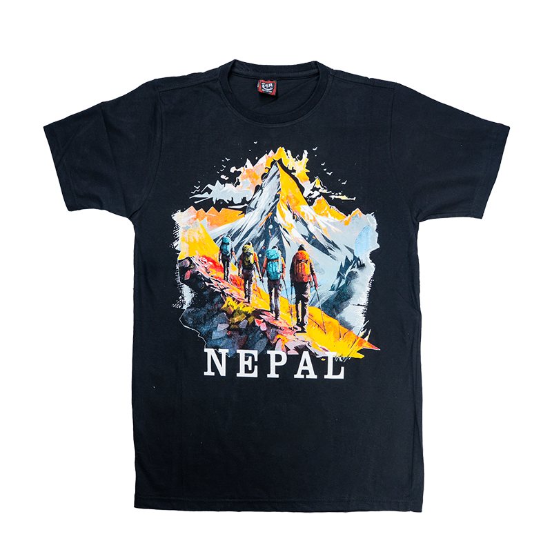 Experience the spirit of the Himalayas with our Nepali T shirt, crafted from 100% premium cotton for ultimate comfort and durability. Designed in a sleek black color, this T-shirt features a striking illustration of towering mountains and four trekkers, symbolizing adventure, unity, and the breathtaking trekking culture of Nepal.