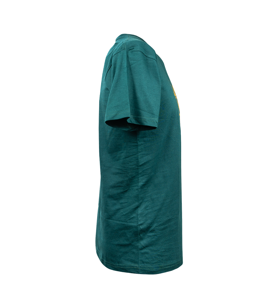 Rich Teal Colorway: The deep, earthy teal fabric provides a high-contrast canvas that makes the golden graphic pop.