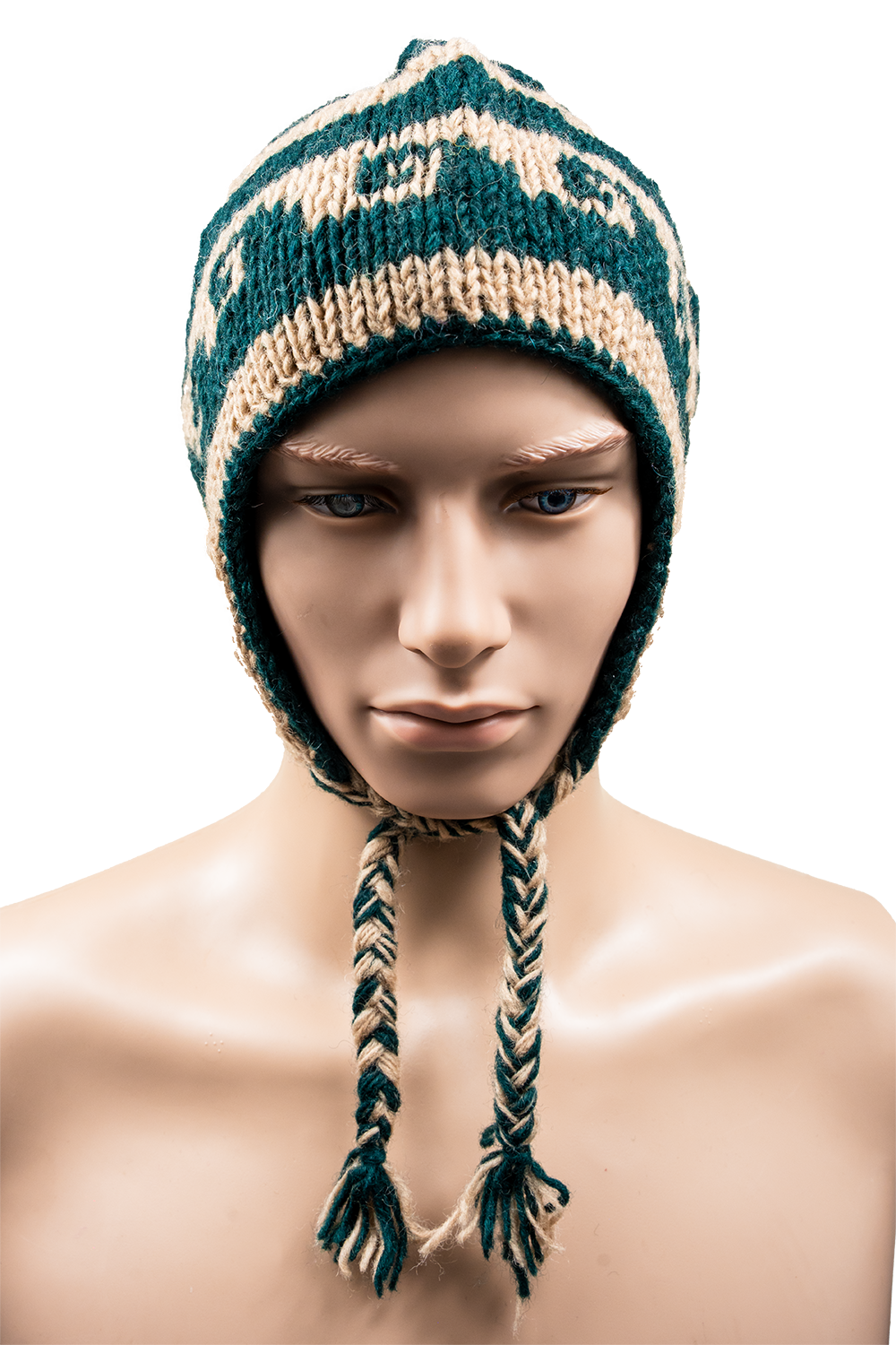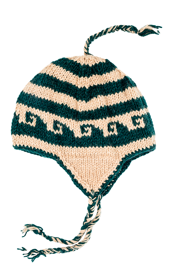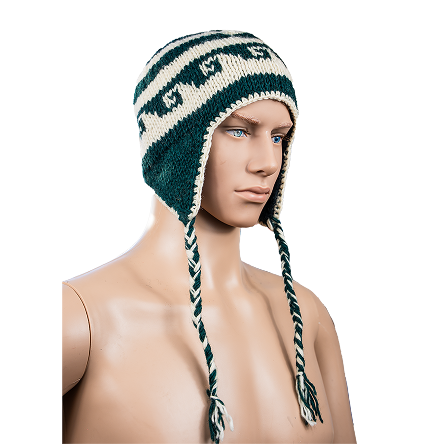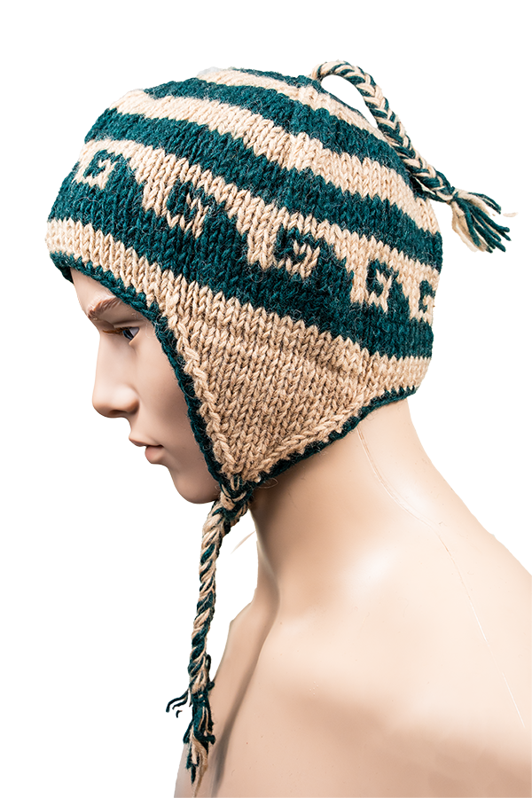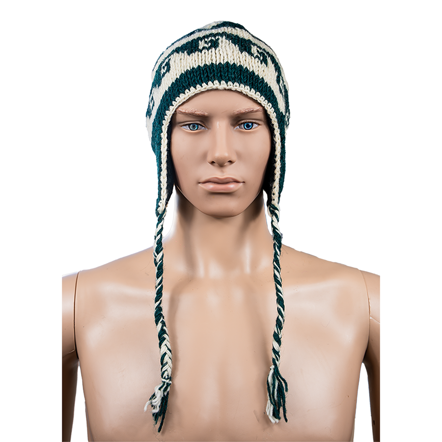Handmade Nepali Woollen Hat – Cream & Green Earflap Beanie | Winter Warm Hat