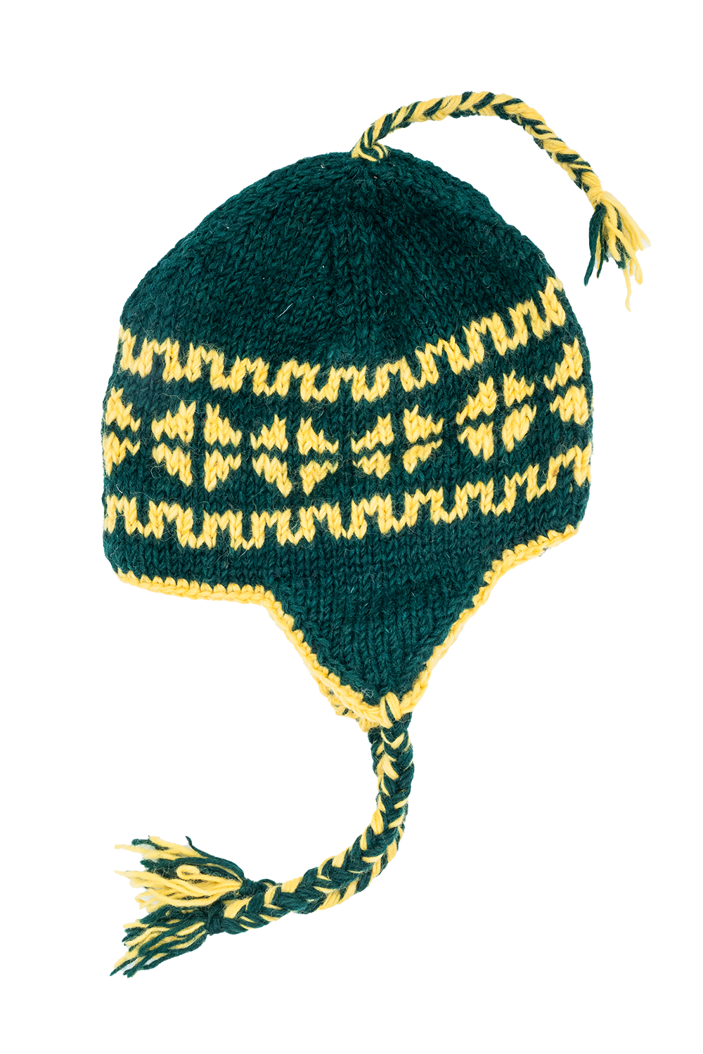 Hand-knitted by skilled Himalayan artisans, this hat combines rich dark green tones with bright yellow traditional patterns. Made from high-quality wool, it offers excellent insulation and winter warmth, while the earflap design protects your ears from cold winds.