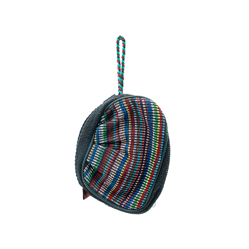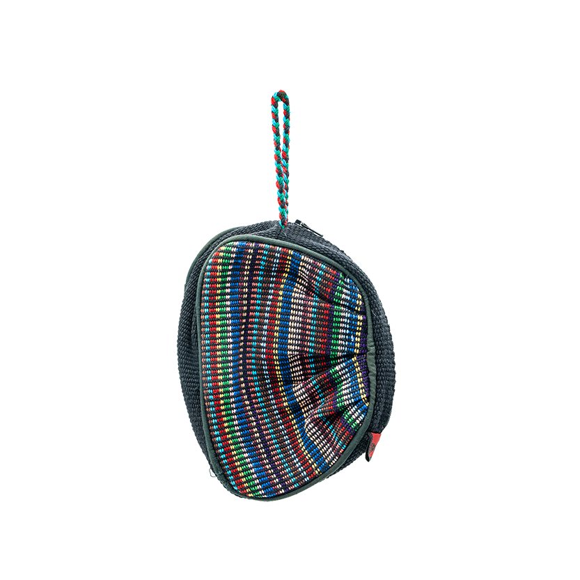 The front of the pouch has a vibrant, multi-colored striped pattern, while the back and sides are a solid, dark color.