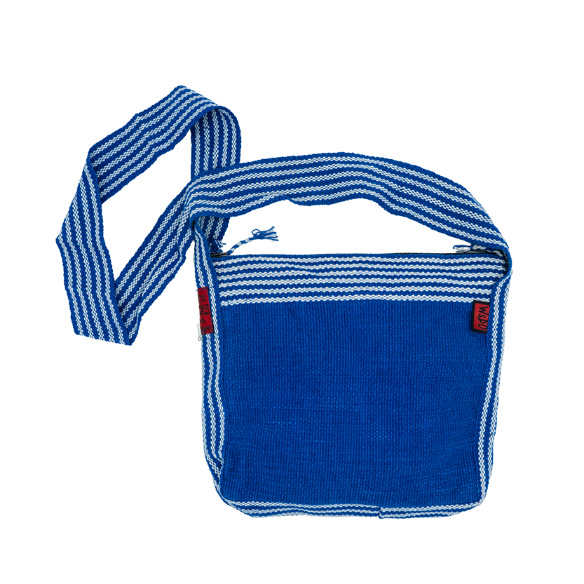 The bag features a striking woven pattern with a solid blue body accented by intricate white stripes on the top border, the front pocket, and the adjustable strap.