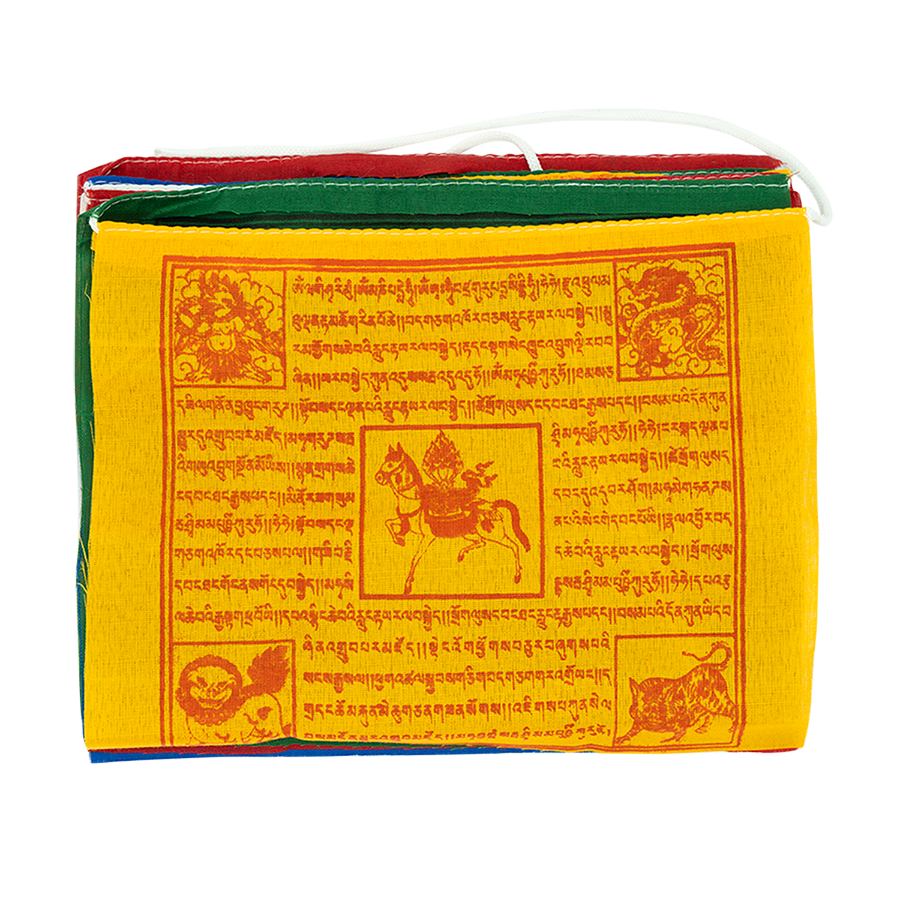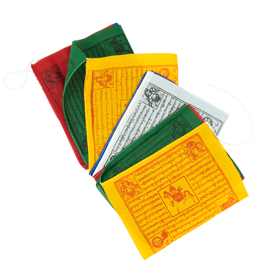 Made from a durable cotton and polyester fabric blend, these prayer flags are suitable for outdoor use, maintaining colour and strength when displayed in gardens, balconies, terraces, temples, or meditation spaces. Each individual flag measures approximately 21 cm x 17 cm, making them compact yet visually impactful.